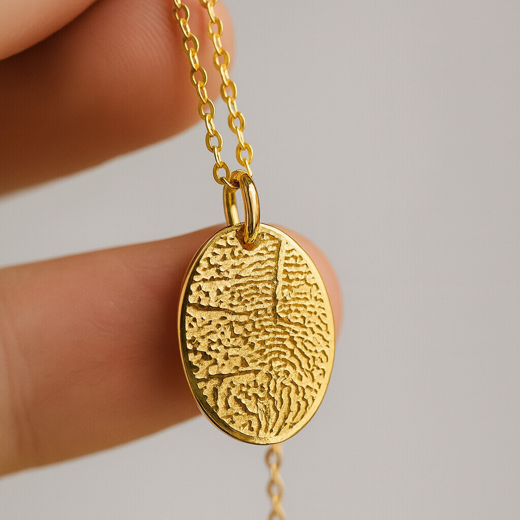 Damit du Schmuck in echter Juwelierqualität erhältst, fertigen wir jedes Stück mit größter Sorgfalt in unserem Studio. Vom Abdruck, dem Design über die Gravur bis hin zur Politur – jedes Schmuckstück wird liebevoll von Hand gefertigt und kommt direkt zu dir. So entsteht personalisierter Schmuck, der so einzigartig ist wie deine Liebe, Erinnerung und Geschichte. Fingerabdruck-Anhänger oval – Erhältlich in Silber, Gold oder Rosé mit Kette in verschiedenen Längen