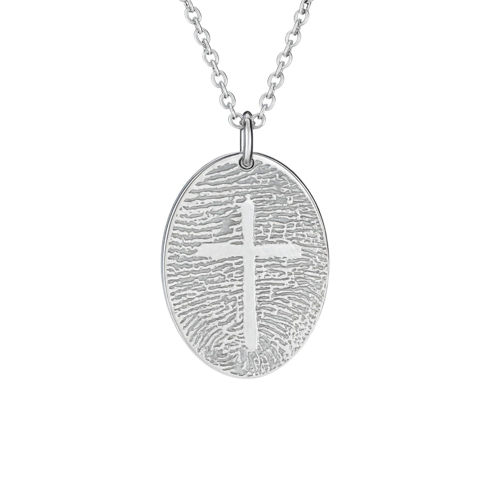 Dieser ovale Anhänger vereint Glaube und Erinnerung – ein detailgetreuer Fingerabdruck als Hintergrund umrahmt das Kreuz in der Mitte. Ein bedeutungsvolles Schmuckstück, das Verbundenheit, Schutz und spirituelle Nähe symbolisiert.