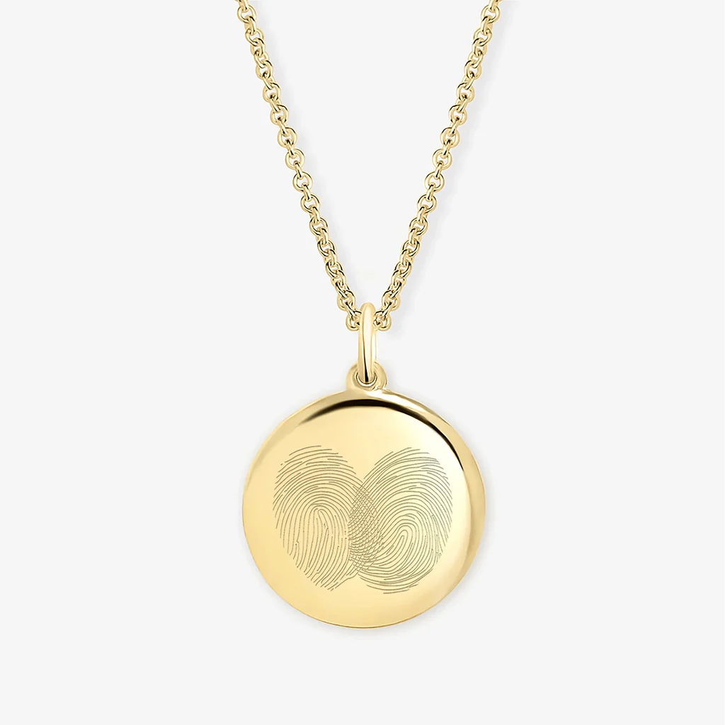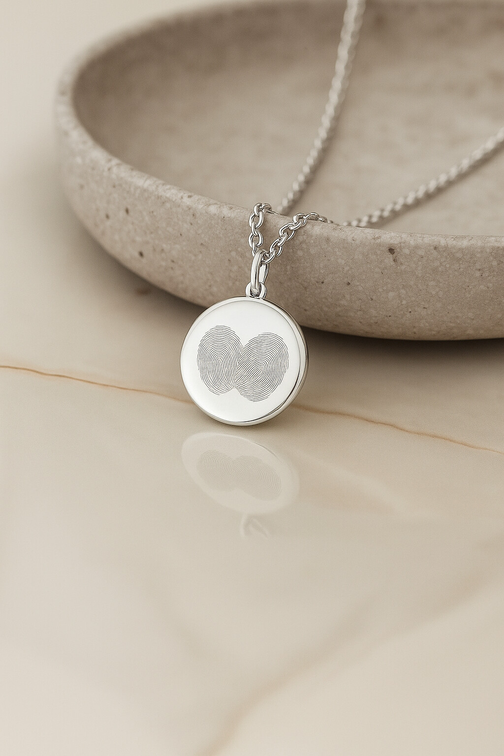 Der runde Anhänger vereint zwei detailgetreue 3D-Fingerabdrücke, die spürbar in die Oberfläche graviert sind. Diese Kette hält nicht nur die Erinnerung an einen geliebten Menschen fest, sondern schenkt auch ein tastbares Gedenken – ein Symbol der Nähe, das du immer bei dir trägst.