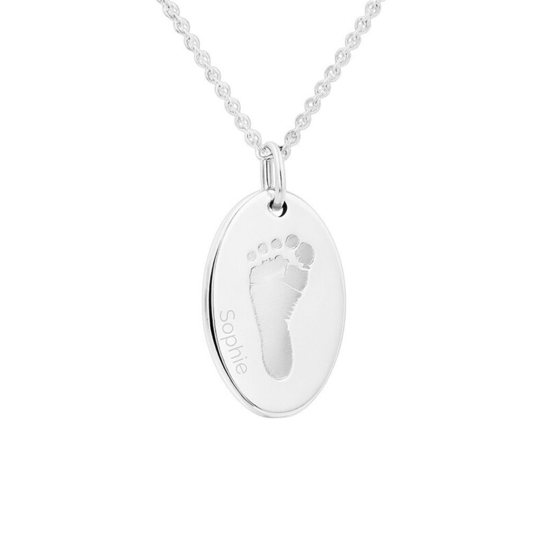 Damit du Schmuck in echter Juwelierqualität erhältst, fertigen wir jedes Stück mit größter Sorgfalt in unserem Studio. Vom Abdruck, dem Design über die Gravur bis hin zur Politur – jedes Schmuckstück wird liebevoll von Hand gefertigt und kommt direkt zu dir. So entsteht personalisierter Schmuck, der so einzigartig ist wie deine Liebe, Erinnerung und Geschichte. Ovale Hand- oder Fußabdruck Kette mit Namensgravur inklusive Kette