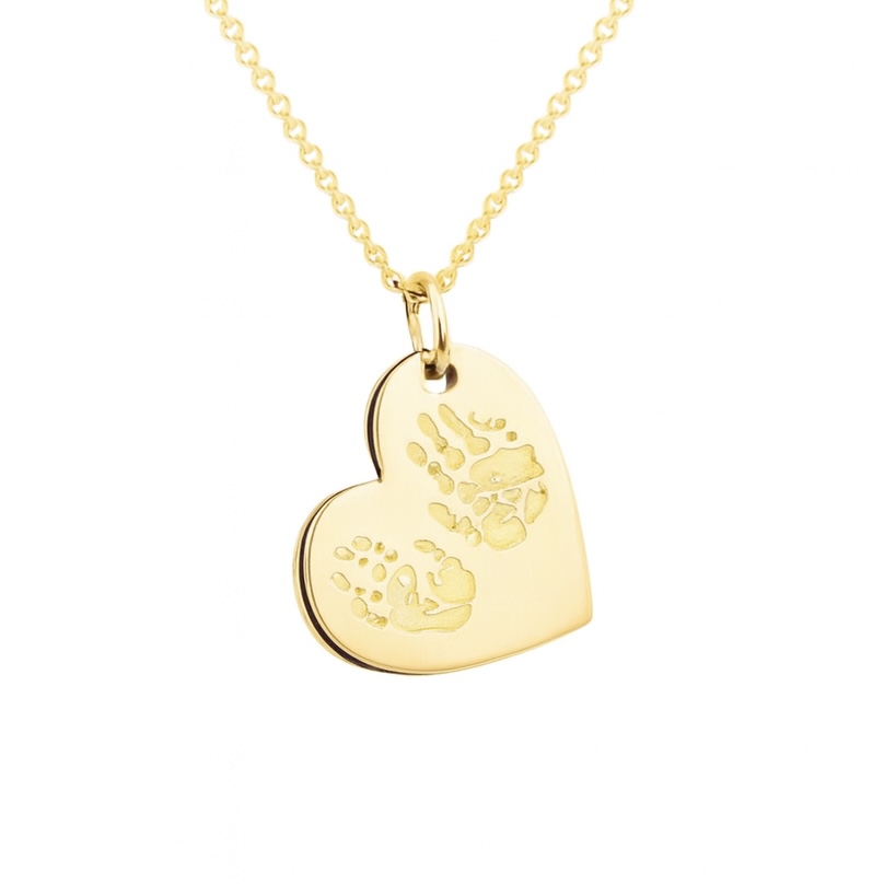 Der originale Abdruck wird detailgetreu in dem Anhänger verewigt. Wunschgemäß können personalisiert zwei Hände, zwei Füße oder eine Hand- und ein Fußabdruck graviert werden.