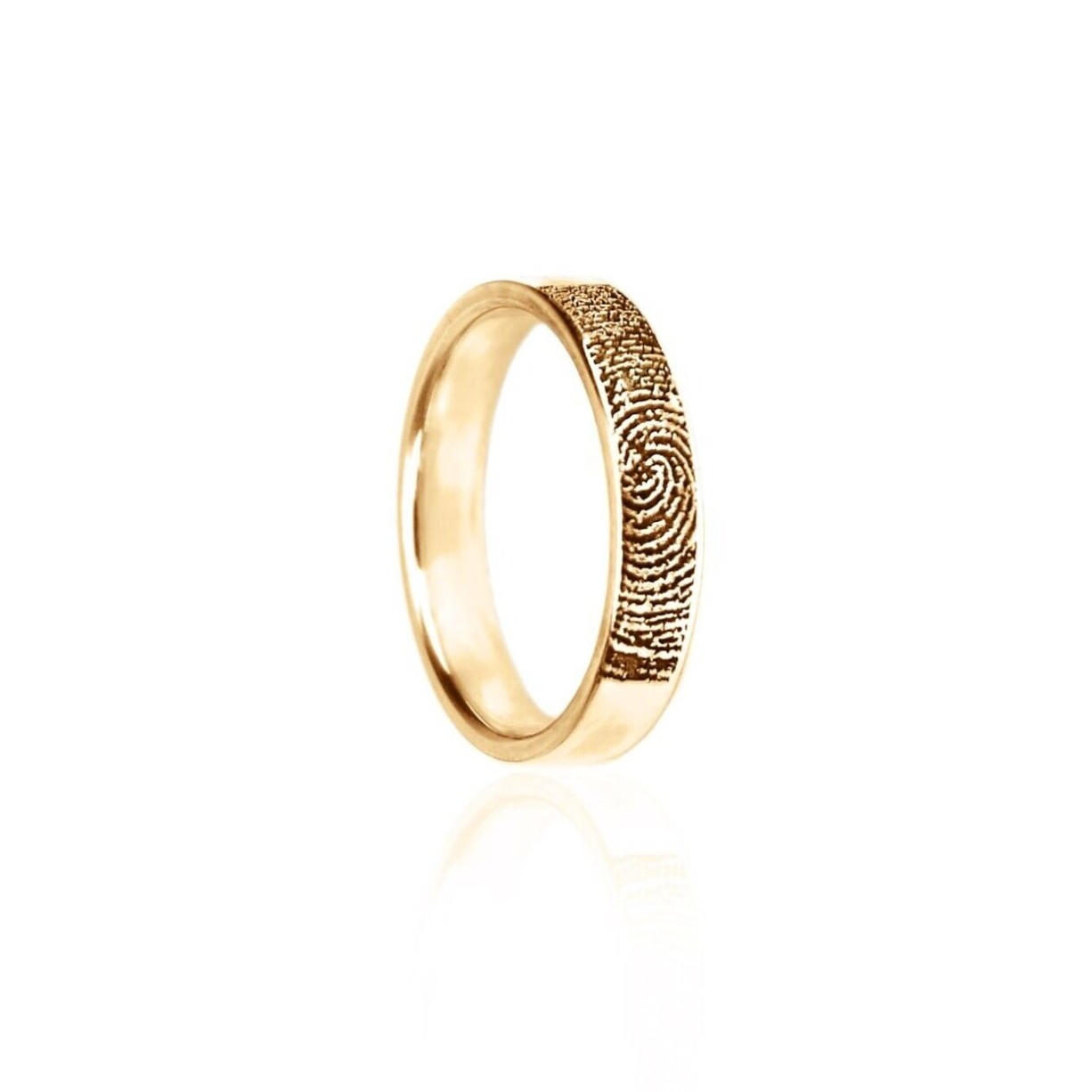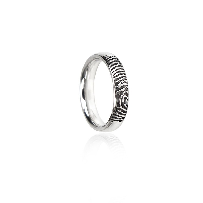 Damenring oder Herrenring mit personalisierter Fingerabdruck-Gravur wahlweise heller oder schwarzer Gravur für mehr optische Tiefe je nach Kundenwunsch.