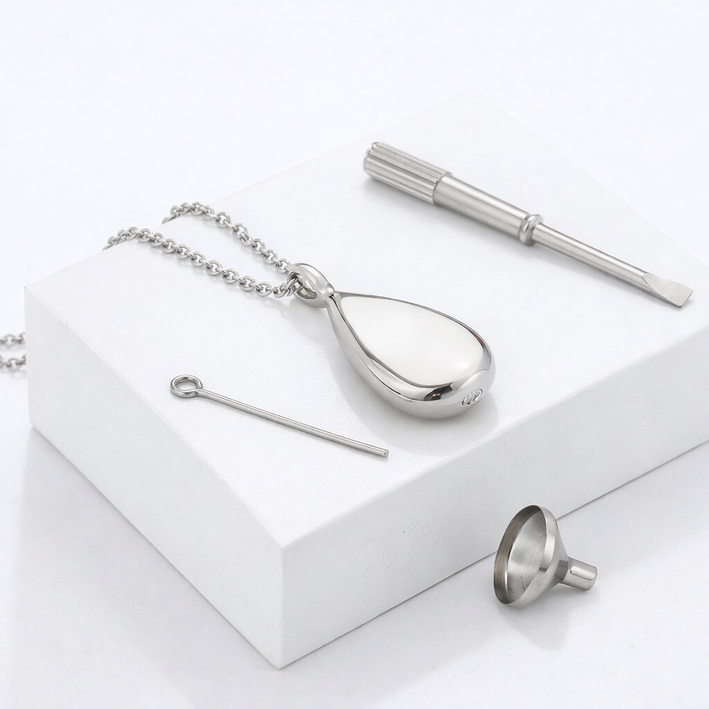 Damit du Schmuck in echter Juwelierqualität erhältst, fertigen wir jedes Stück mit größter Sorgfalt in unserem Studio. Vom Abdruck, dem Design über die Gravur bis hin zur Politur – jedes Schmuckstück wird liebevoll von Hand gefertigt und kommt direkt zu dir. So entsteht personalisierter Schmuck, der so einzigartig ist wie deine Liebe, Erinnerung und Geschichte. Zubehör Set für Aschekapseln und Urnenschmuck