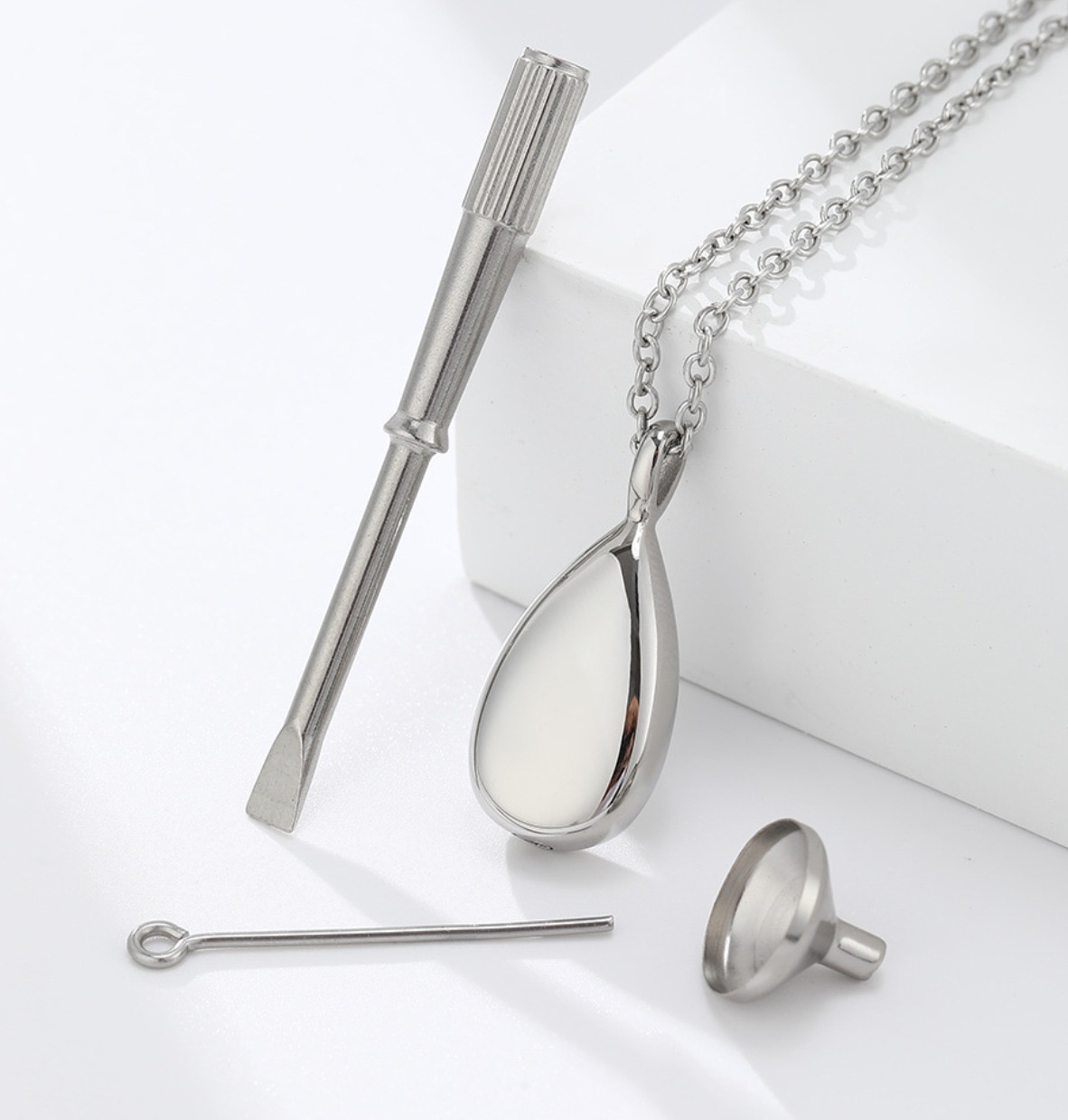 Die Urnenkette befüllt mit Asche, Blüten, Parfüm oder Haaren ist ein wundervolles Erinnerungsstück. Dieses Einfüll Set hilft dabei damit alles behutsam in den Hohlraum des Schmuckanhängers gelangt.