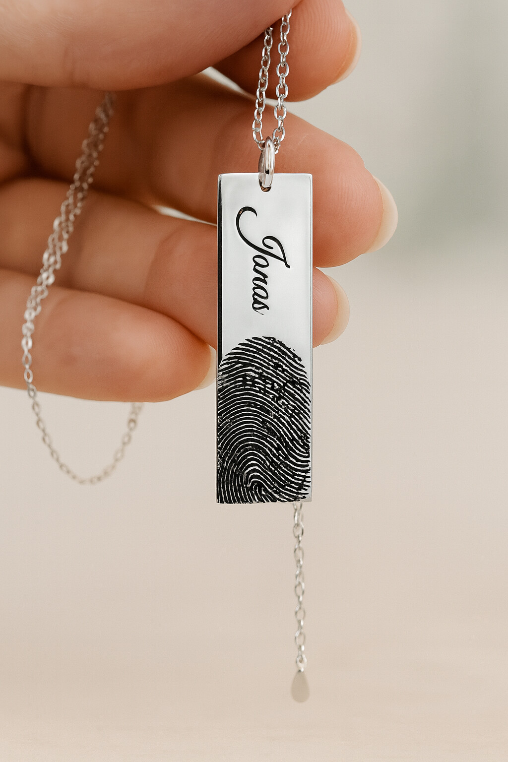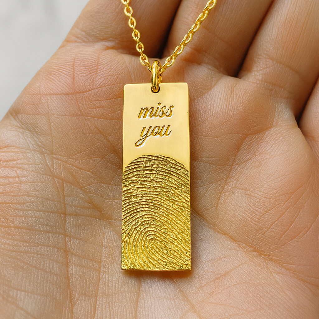 Damit du Schmuck in echter Juwelierqualität erhältst, fertigen wir jedes Stück mit größter Sorgfalt in unserem Studio. Vom Abdruck, dem Design über die Gravur bis hin zur Politur – jedes Schmuckstück wird liebevoll von Hand gefertigt und kommt direkt zu dir. So entsteht personalisierter Schmuck, der so einzigartig ist wie deine Liebe, Erinnerung und Geschichte. Eckiger Anhänger mit Fingerabdruckgravur – Wählbar in Silber, Gold oder Rosé, inklusive Kette in verschiedenen Längen