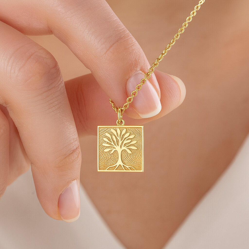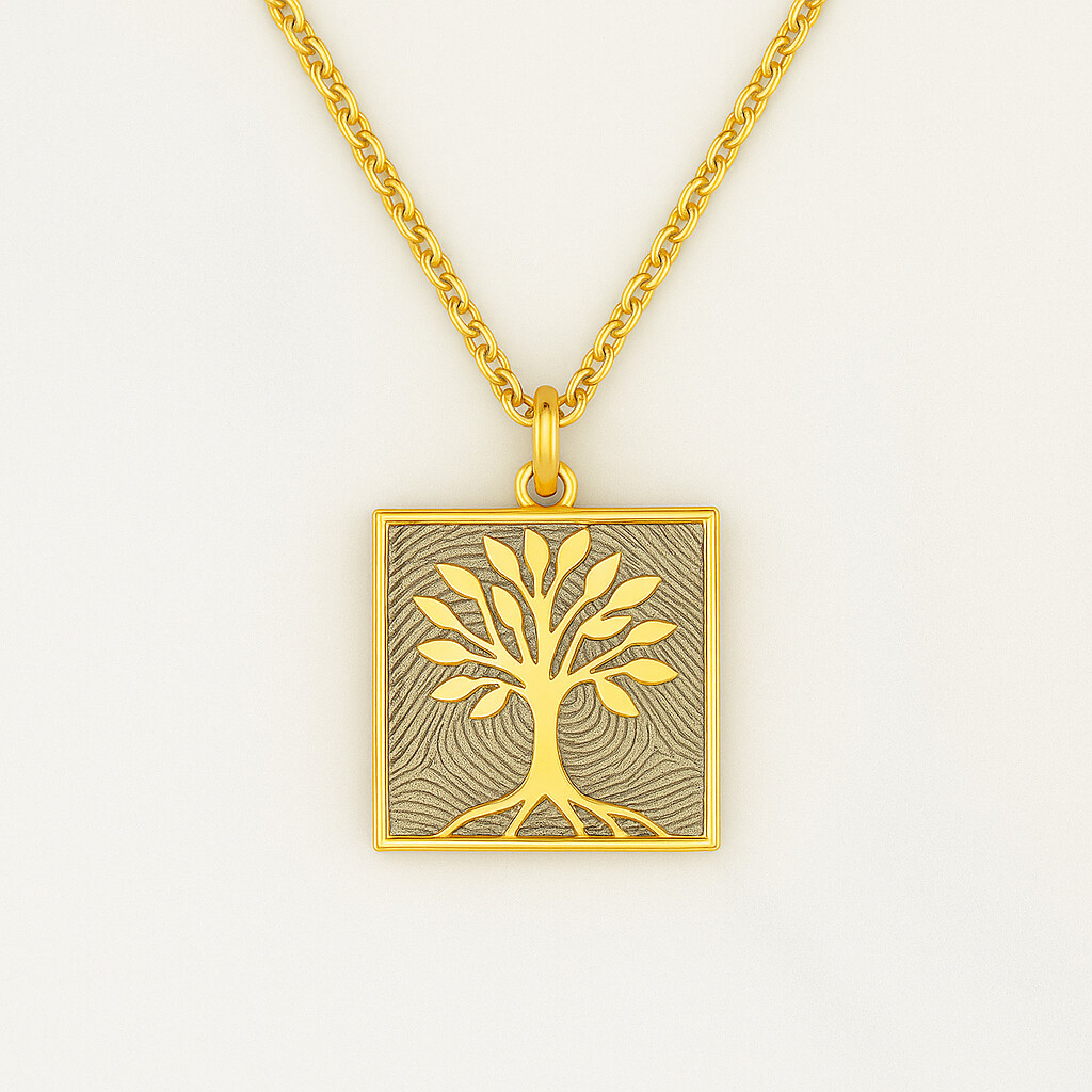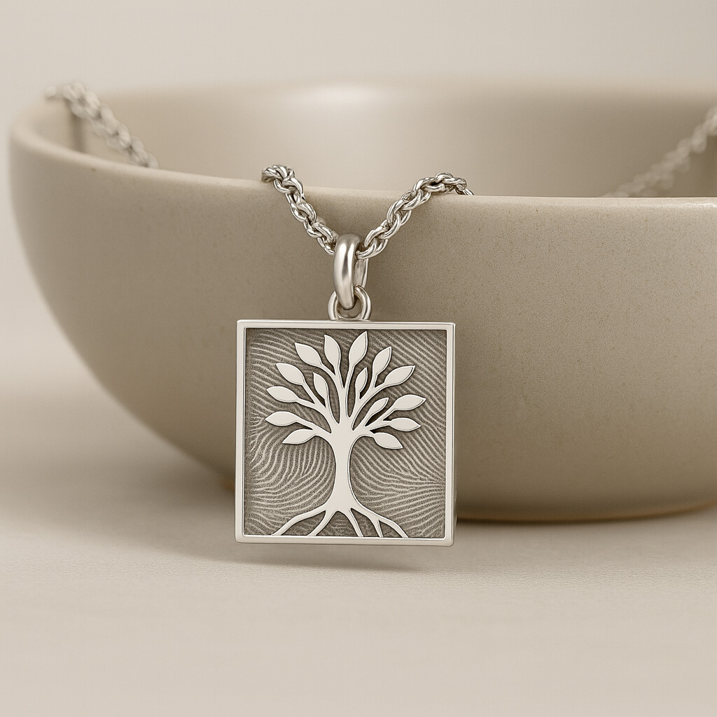 Damit du Schmuck in echter Juwelierqualität erhältst, fertigen wir jedes Stück mit größter Sorgfalt in unserem Studio. Vom Abdruck, dem Design über die Gravur bis hin zur Politur – jedes Schmuckstück wird liebevoll von Hand gefertigt und kommt direkt zu dir. So entsteht personalisierter Schmuck, der so einzigartig ist wie deine Liebe, Erinnerung und Geschichte. Eckiger Lebensbaum-Anhänger mit individuellem Fingerabdruck – Ein Zeichen tiefer Wurzeln und Erinnerungen
