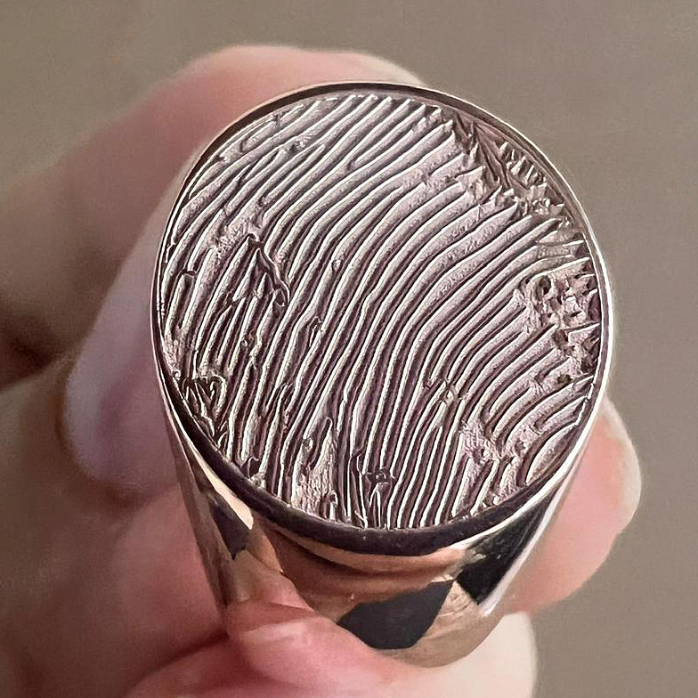 Hier werden die erhabenen, hellen Linien des Fingerabdrucks präzise in das Edelmetall graviert.